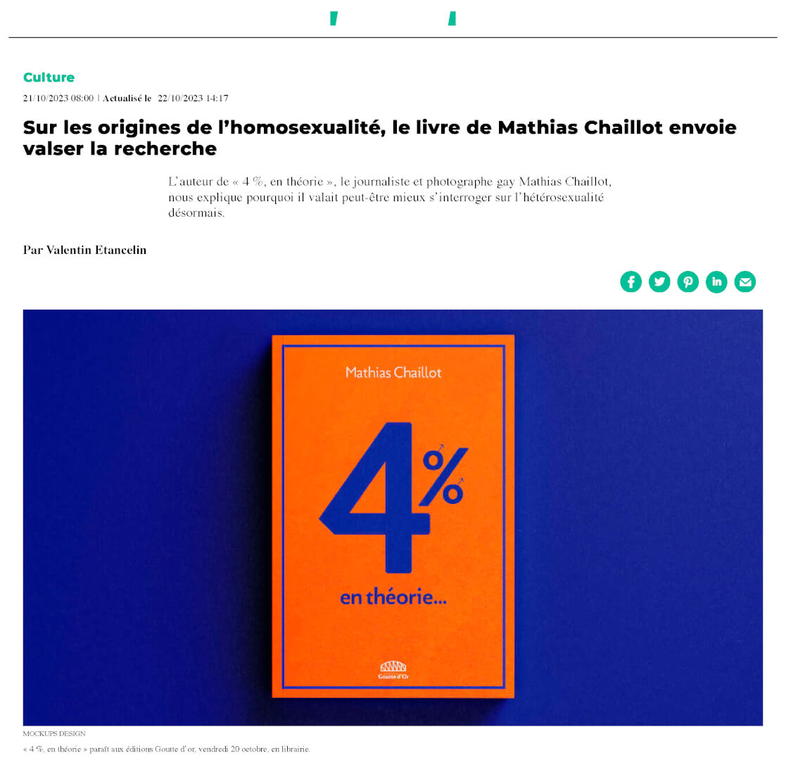 Publié aux éditions Goutte d’or (oct. 2023), 4% en théorie… est le fruit de trois ans d’enquête sur les théories scientifiques tentant d’expliquer l’homosexualité. Du milieu du XIXe siècle aux hypothèses génétiques les plus récentes, il retrace l’histoire de ces théories, leur validité scientifique, le parcours et les motivations des hommes et les femmes qui les ont formulées, et les implications sociales, politiques et éthiques de tels travaux.