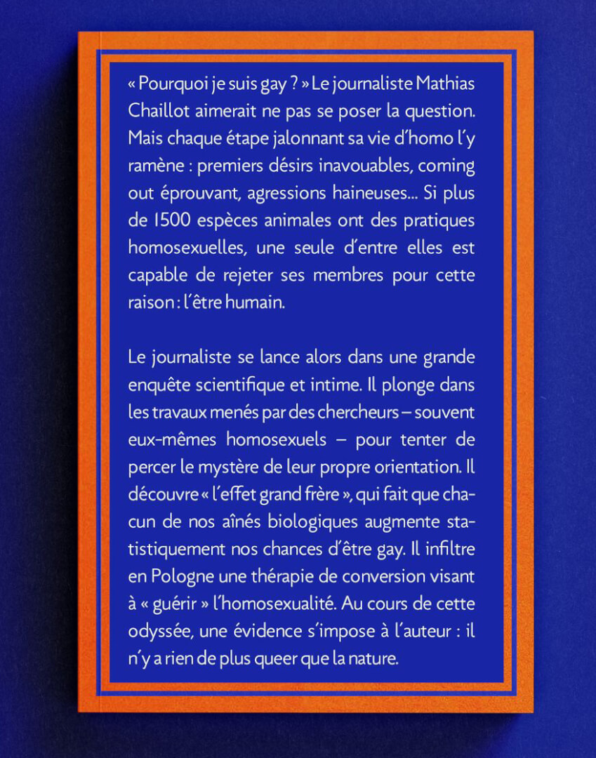 Pitch : “Pourquoi je suis gay ?” Le journaliste Mathias Chaillot aimerait ne pas se poser cette question. Mais chaque étape jalonnant sa vie d’homo l’y ramène : premiers désirs inavouables, coming out éprouvant, agressions haineuses… Si plus de 1500 espèces animales ont des pratiques homosexuelles, une seule d’entre elles est capable de rejeter ses membres pour cette raison : l’être humain.